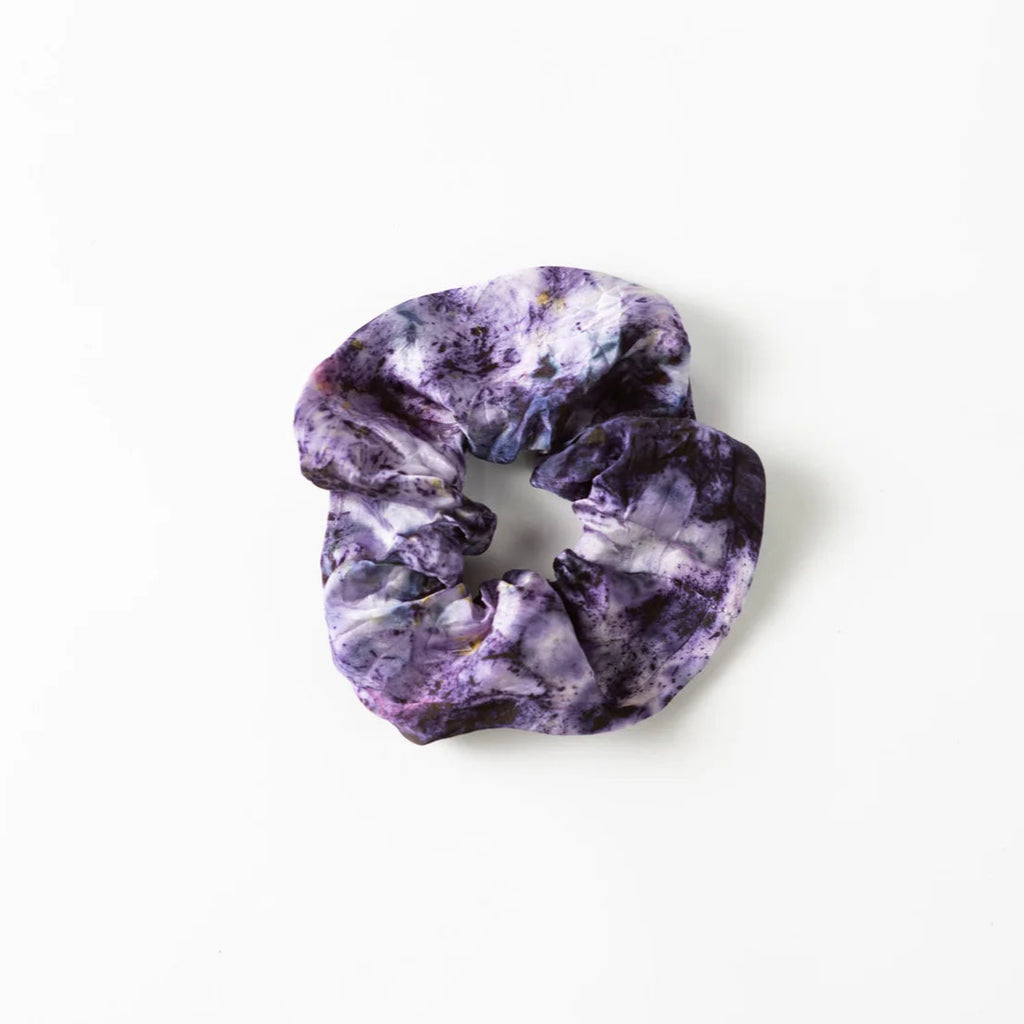 Silk scrunchie hand-dyed with flowers and other natural dye extracts. Durable rubber band inside. Artist Choice Multi natural dyed pattern.