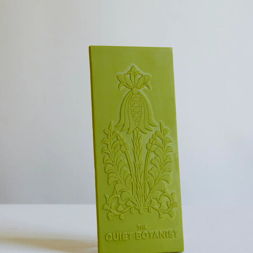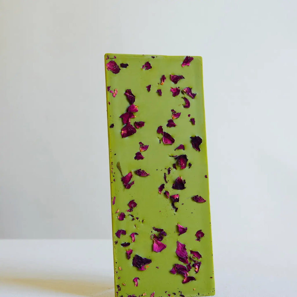 Matcha Rose is our green beauty. Beautiful green Matcha in a white chocolate base sprinkled with Rose Petals. Small batch, ethically sourced, fair trade and handmade. Price increase due to increased tariff increase. Wrapped in a botanical print, the large bar is revealed to be a gorgeous moody gold foil that highlights the green botanical stamp chocolate. White Chocolate with Ceremonial Grade Matcha & Organic Rose Petals. The reverse side is covered with rose petals which contrasts beautifully with the green chocolate base. 3.5oz/100g Dimensions: 4.8 in x 9 inches Shelf life: 18 months Storage: Shelf-stable. Made in USA