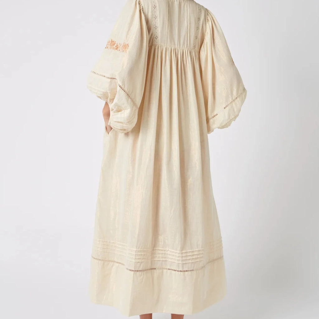 A truly stunning gown in a fluid lightweight gold lurex cotton with fabulous oversize balloon sleeves.