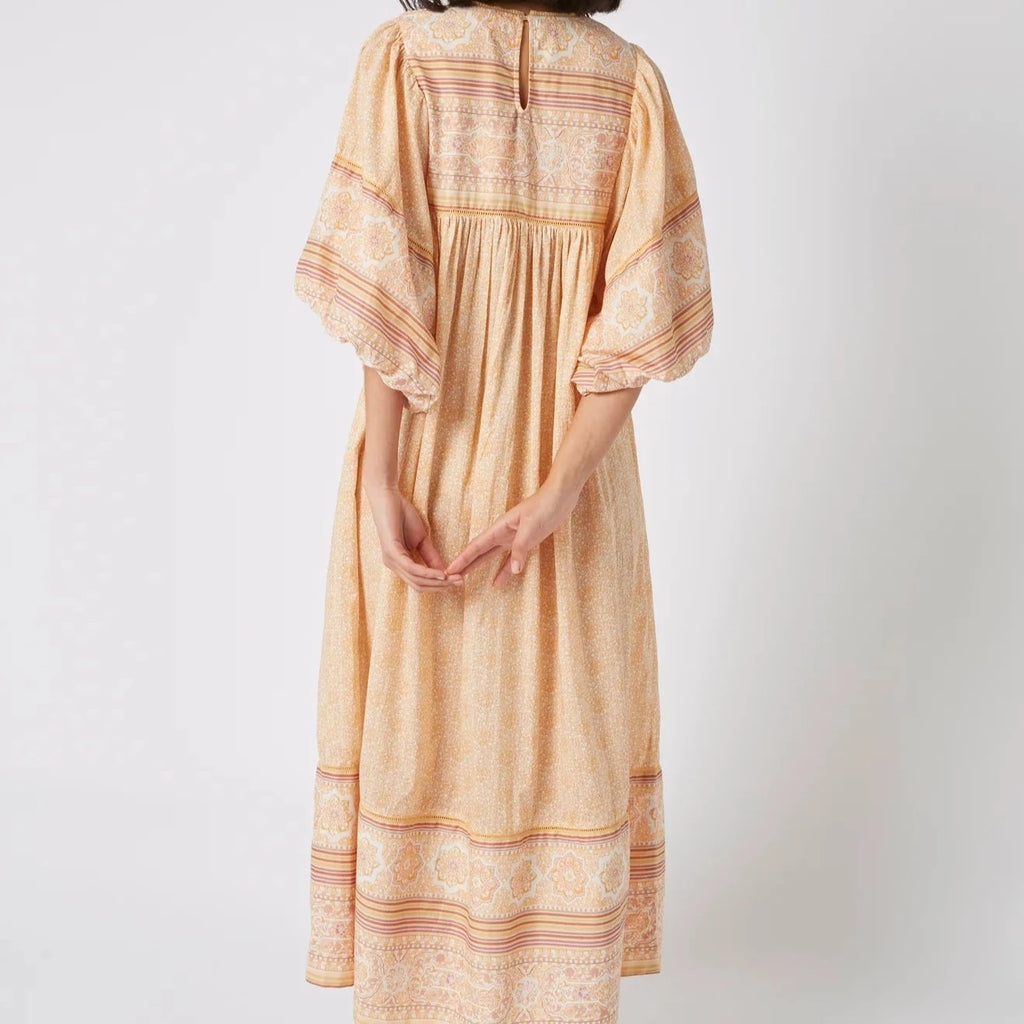 A beautiful cotton house dress in a pretty border print in our signature vintage peach tones. The dramatic puff sleeves and a square neckline give this style a very modern edge and the delicate lace trims add a vintage touch. With the added advantage of side seam pockets and lots of gathers for a loose and comfortable fit - we are sure you will love this piece for lounging at home and relaxing on sunny days out!