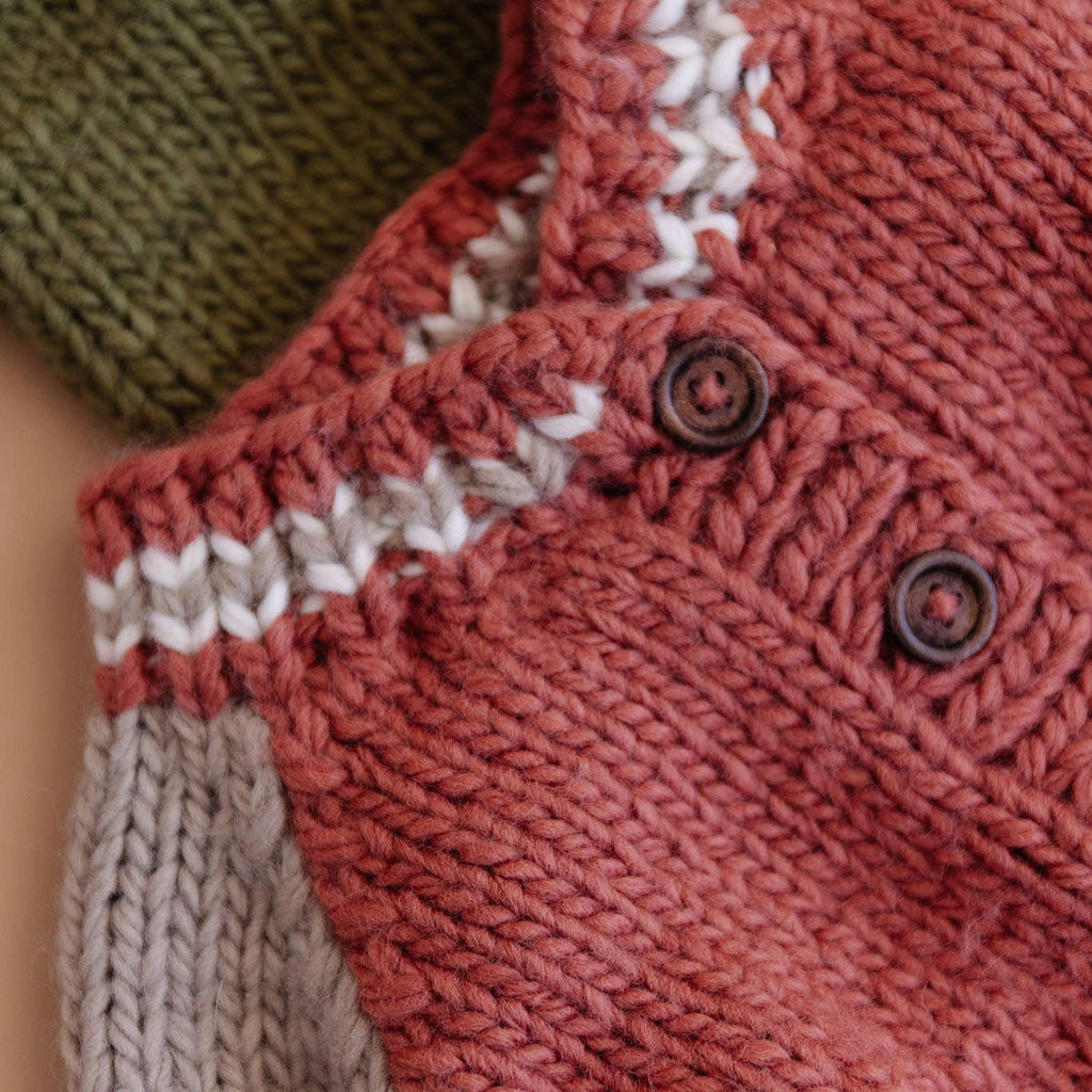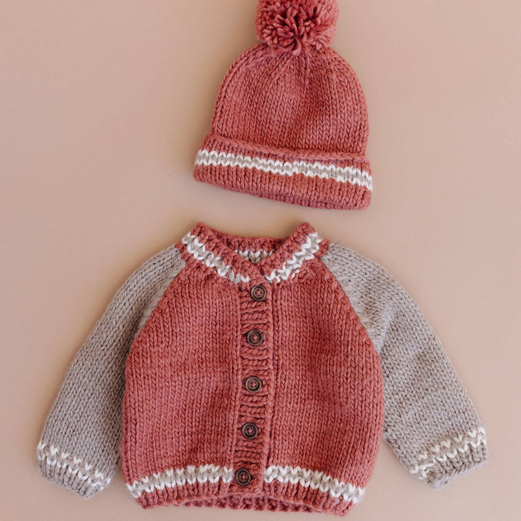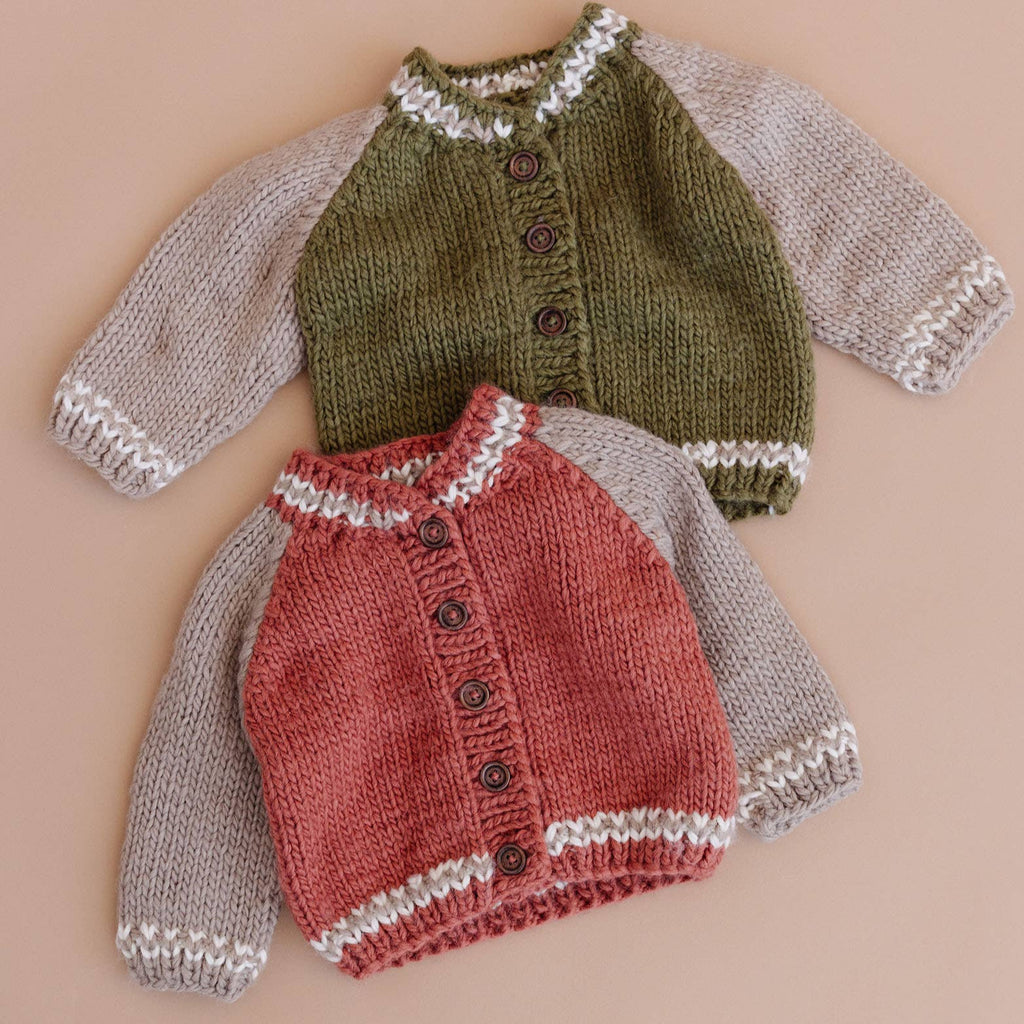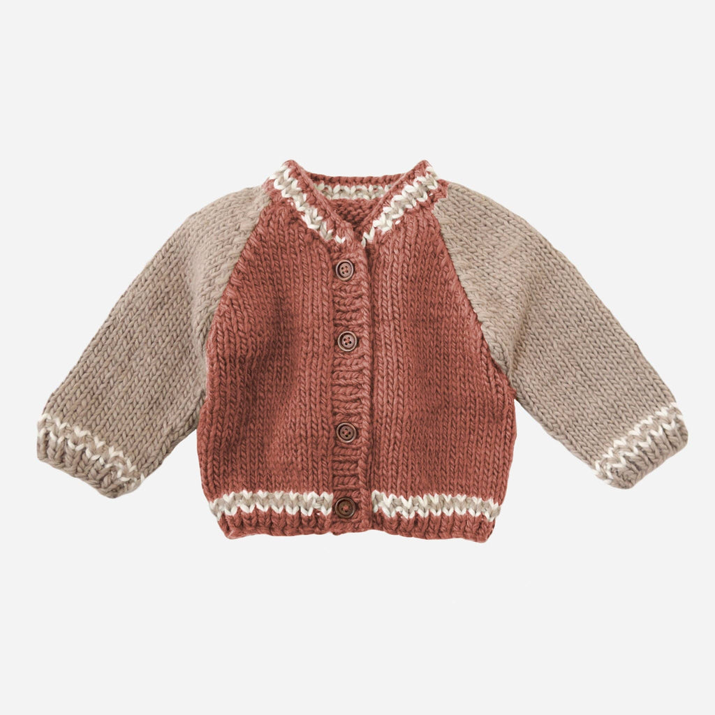 Get your head in the game with our Varsity Cardigan in Redwood. Featuring Flax sleeves and Cream trim, this sporty cardigan is the perfect fall outfit. • Designed in Salt Lake City • Crafted with care using 100% Hand-knit acrylic • Hand wash and lay flat to dry