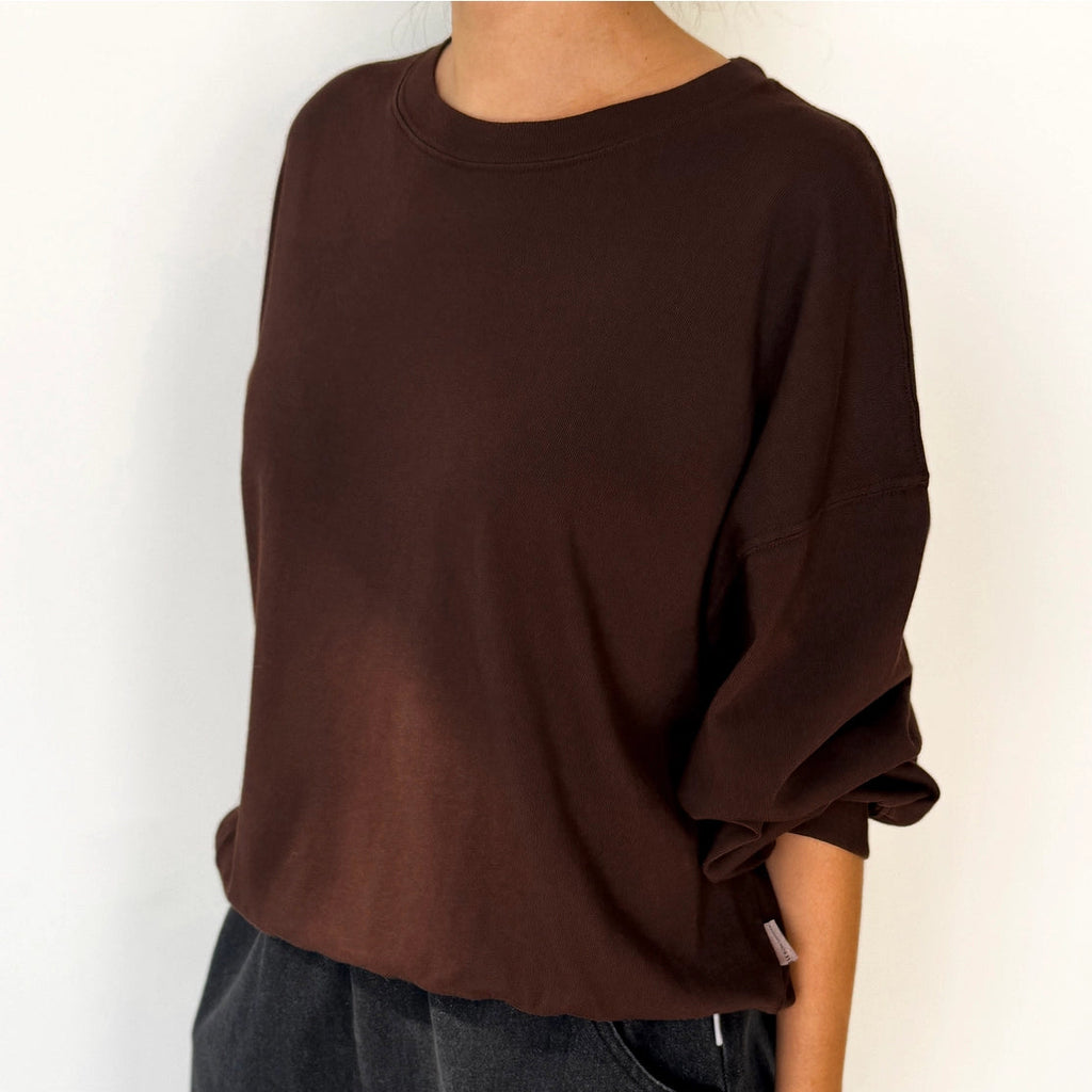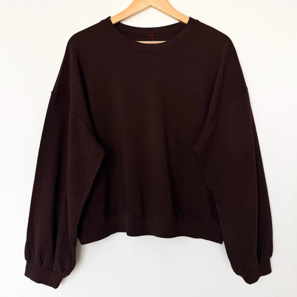 Why we made this: The Cali Jersey Sweatshirt blends the best of The Little Boy Tee and the Poche Top for a playful take on the classic crewneck. Crafted from 100% premium cotton jersey, it offers the lightweight feel of the Little Boy Tee, making it ideal for layering under jackets. It also borrows signature details from the Poche Top, like a ribbed crew neckline and relaxed balloon sleeves. Designed with a slightly oversized fit, it features a perfectly cropped length, creating the perfect balance of style Made in Los Angeles, USA Contents:100% COTTON PREMIUM JERSEY Care Instructions: Due to the nature of pigment dye, loose pigments may remain on the surface of the garments. - Do not spot clean - Washing these garments only with like colors and in cold water - Hang Dry Approximate Measurements: Small : Chest - 23”, Length - 22 1/2” Medium : Chest - 24” , Length - 23” Large : Chest - 25”, Length - 23 1/2" Model is 5' 6", 110 lbs and wearing a size small