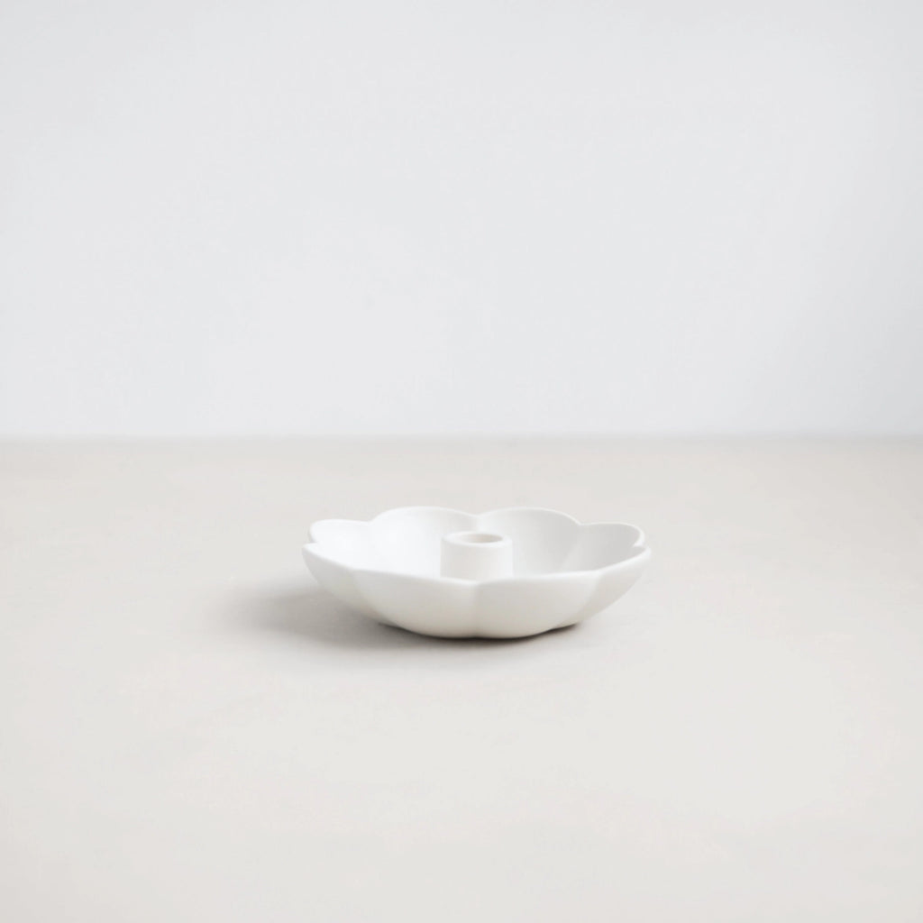 Featuring a scalloped edge that adds softness and modernity, the Fleur Taper Holder is as beautiful as it is functional. The blossoming petal shape, raised rim and natural, matte-white finish is a fresh variation in shape and form. The holder is sized to fit a standard taper candle and pairs perfectly with the classic white ceramics in our collection. Dimensions: Regular: 3.5" D x 1.5" H Wide: 6.375” D x 1.5” H Designed by The Floral Society