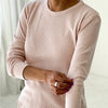 100% Cotton Pointelle jersey Due to the nature of pigment dye, loose pigments may remain on the surface of the garments. -Do not spot clean -Washing these garments only with like colors and in cold water -Hang Dry