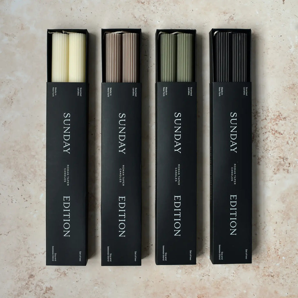 Sunday Edition's Roman Taper Candles are formulated with essential oils, natural aromatics or plant derived scent molecules. We use a custom blend of soy-beeswax and premium cotton wicks that contain no additives or chemicals for a clean burn. Our candle colors are made from vegetable dyes and contain no hazardous solvents or toxins. Packaging is made with sustainable and biodegradable materials. • Set of two • Soy-beeswax blend • Vegetable dye • Cotton wick • Length: 10" • Weight (each): 4.5oz | 255g • Est. burn time: 5 - 8 hours