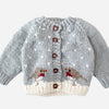 Walk in a winter wonderland with our Robin Cardigan in Bowie Grey. Featuring Cream snowfall and two Flax-colored birds, this cardigan is sure to keep your little robin warm. Pairs with our Sawyer Hat in Bowie Grey. • Designed in Salt Lake City • Crafted with care using 100% Hand-knit acrylic • Hand wash and lay flat to dry